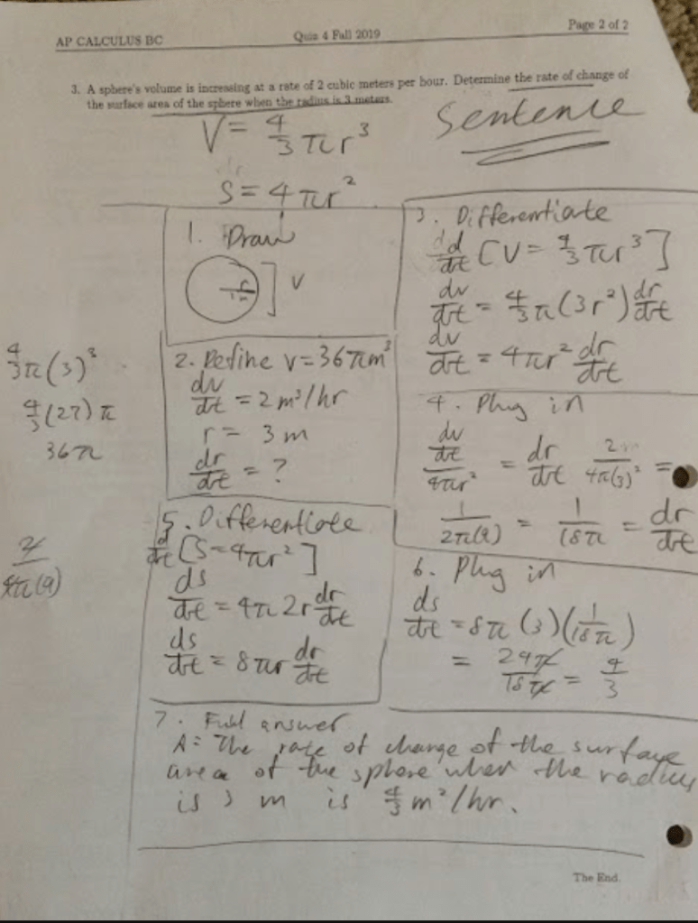 In the numbered box method, you number the steps for solving a problem with a brief description in 1-3 words about the step. Then, write neatly line by line for solving the problem that involves calculations. When you complete the first step, you should box the first step and then make a new box for your second step. Keep doing this until you finished the math problem. Although it may sound tedious to box your work and write the steps, I find it to be a very good way of organizing your work and forcing yourself to not have messy handwriting. If I write messy, the xs look like ys, and then the 0s look like 9s. Another important thing about handwriting is to not have small handwriting that is crammed together. Maybe I am wrong (as I cannot speak on behalf for people with small handwriting), but I think spacing out your work really helps see things more clearly.